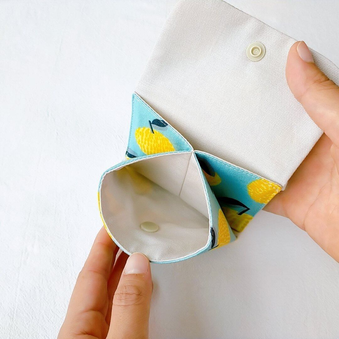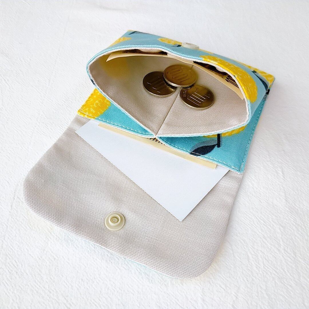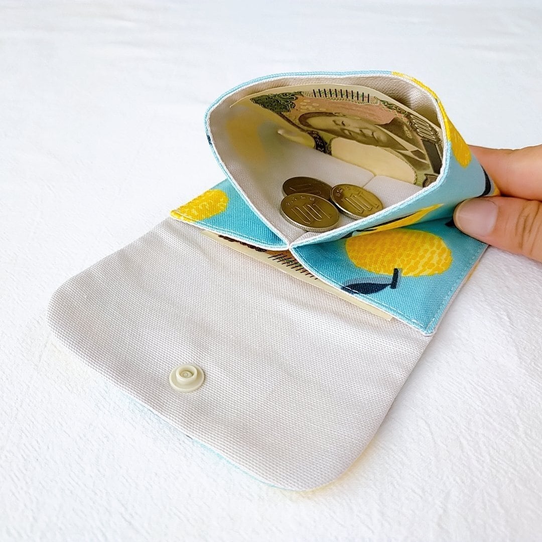 お札が折らずに入るし、小銭も入れられる。入口が大きく開くので見やすく、振っても落ちない!カードも入るのにとってもコンパクト!